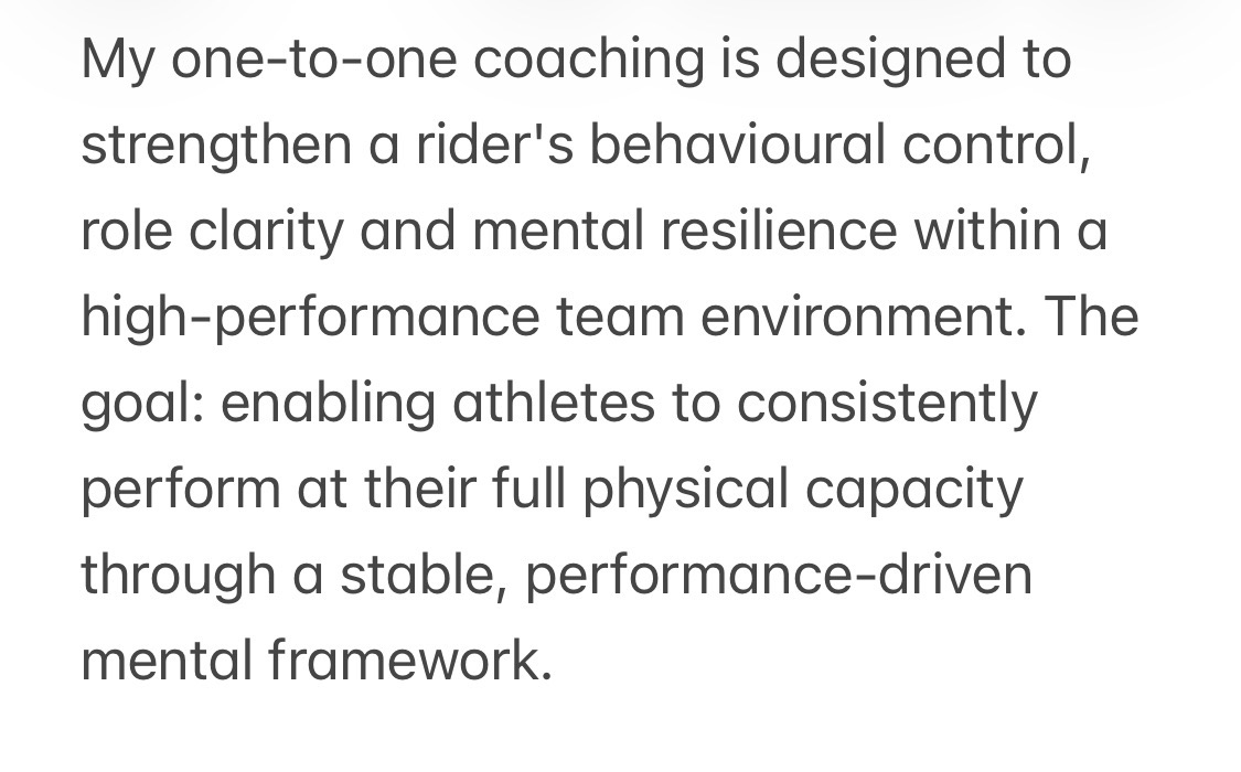 My one-to-one coaching is designed to strengthen a rider's behavioural control, role clarity and mental resilience within a high-performance team environment. The goal: enabling athletes to consistently perform at their full physical capacity through a stable, performance-driven mental framework.